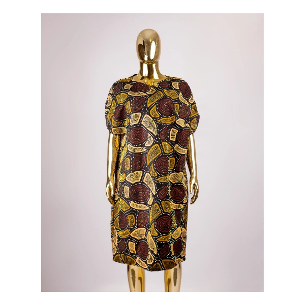 Crafted from premium Ankara fabric, this dress features full embellishment that adds a refined sparkle without overpowering its rich chocolate tone.