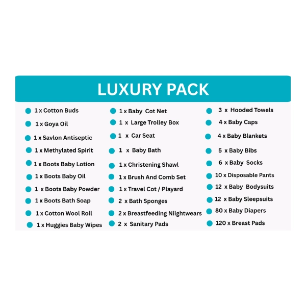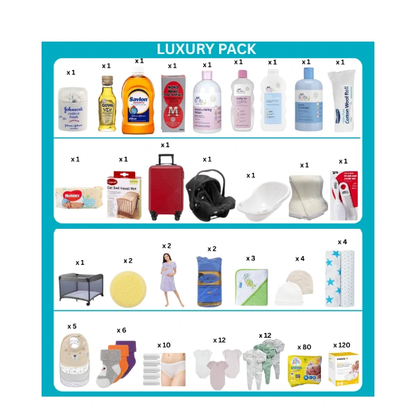 As the name implies, it contains a wider range and much more quantities of luxurious baby and mom products.