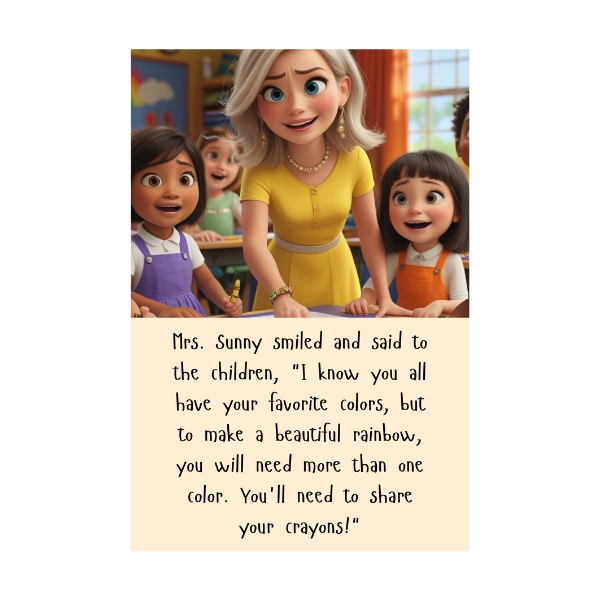 During an art class, the children learned that the only way to create a beautiful rainbow was to share their favorite colors, not hold on to them.