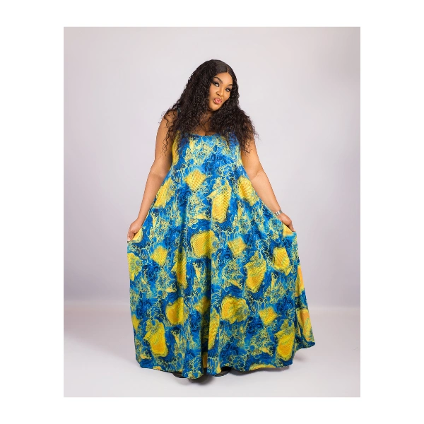 This long multi-colored dress, in a beautiful vibrant mix of sunshine yellow and blue fabric is lightweight and flowy.